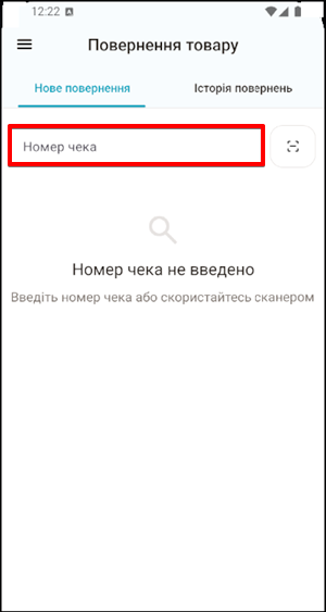 - Сканування: натисніть на іконку сканера, розташовану праворуч від поля введення. Камерою пристрою зчитайте QR-код або штрихкод із паперового чека для автоматичного внесення номера чека в поле Номер чека: