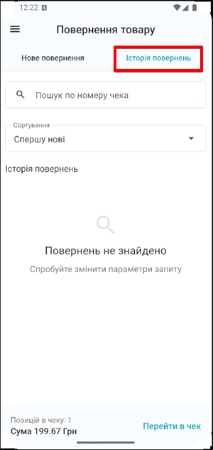 Щоб переглянути історію попередніх операцій оберіть вкладку Історія повернень.